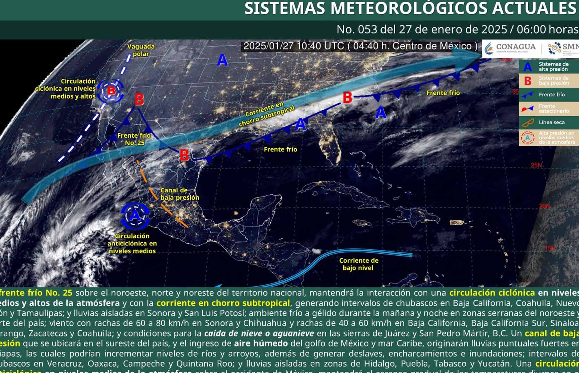 Por otro lado, el frente frío número 25 se extenderá este día sobre el norte y noreste de la República Mexicana.