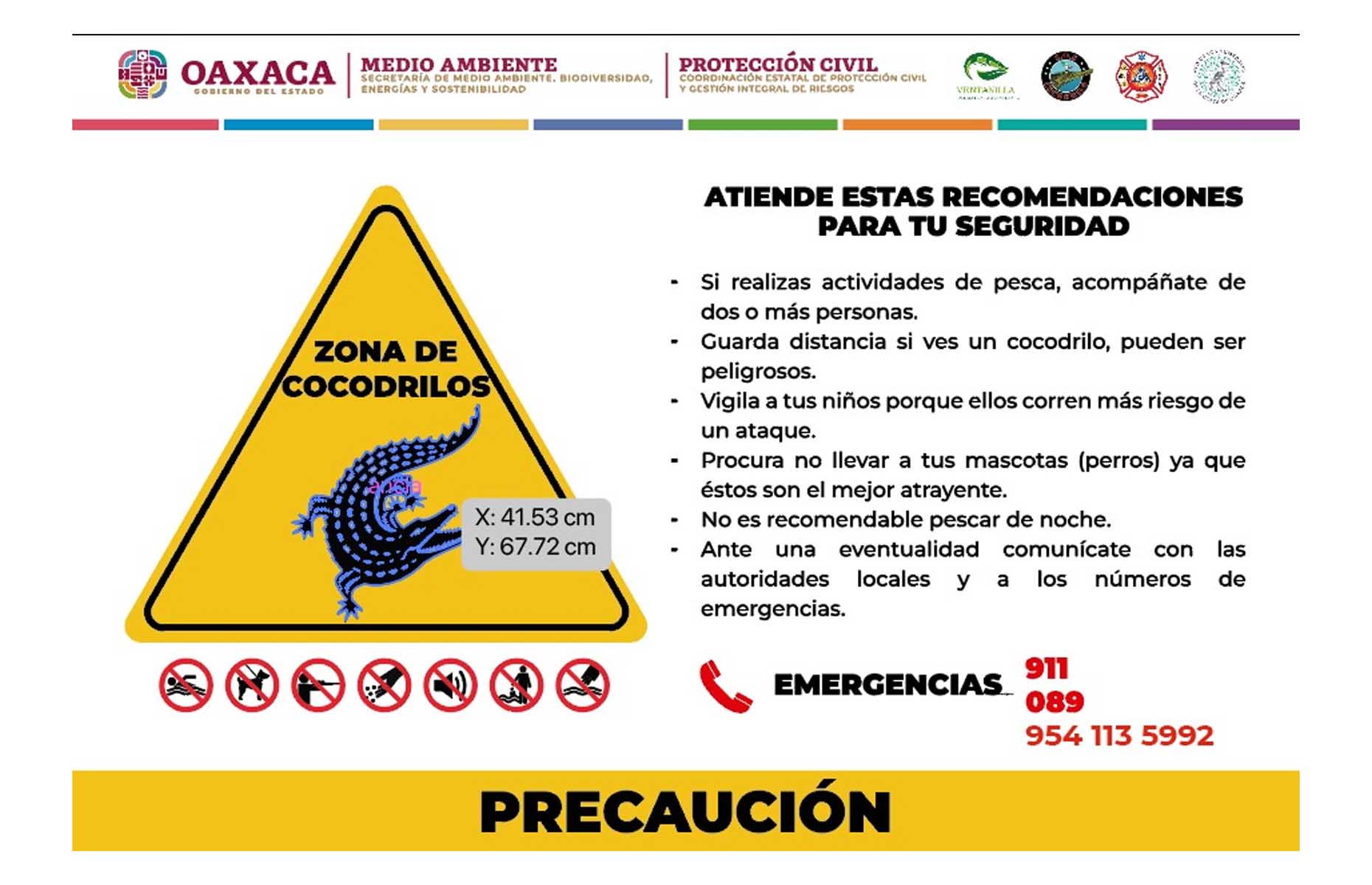Se informa que la Red de los Humedales Costeros de Oaxaca cuenta con grupos de atención SOS Cocodrilos en las comunidades de Puerto Escondido, Chacahua y Santa María Tonameca, que pueden ser contactados al teléfono 954 113 5992 para el manejo y contención responsable de los ejemplares, en caso de ser necesario.