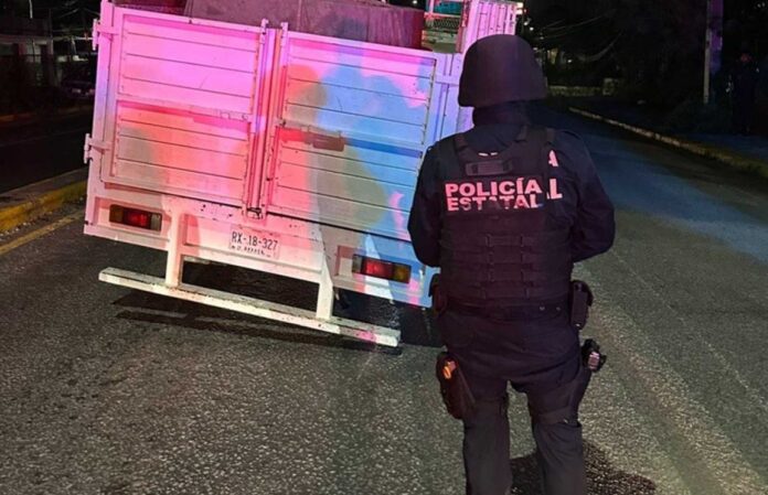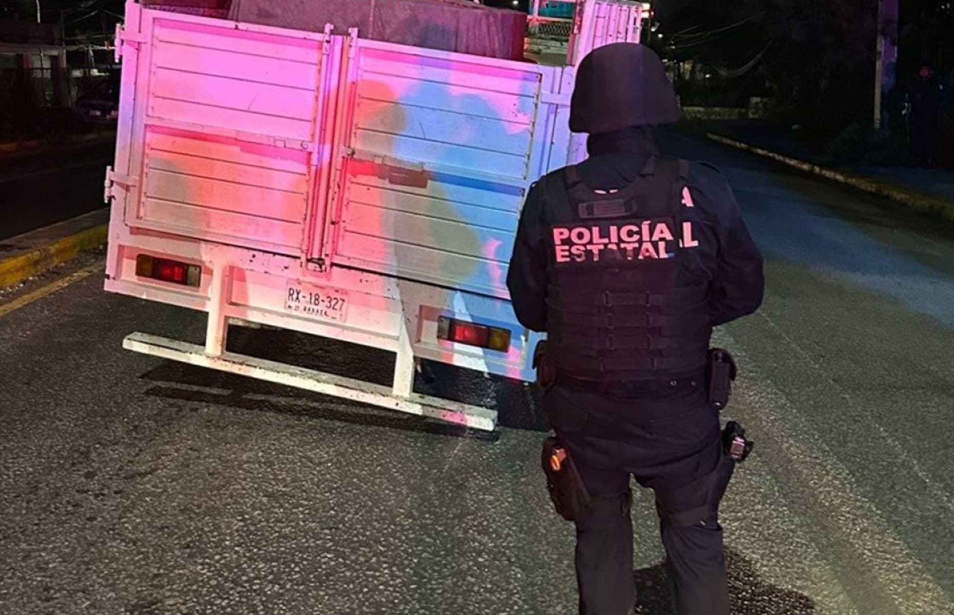 En ese punto, personal de la Policía Estatal localizó una camioneta Ford blanca, de tres toneladas, con placas RX-18-327, aparentemente abandonada.