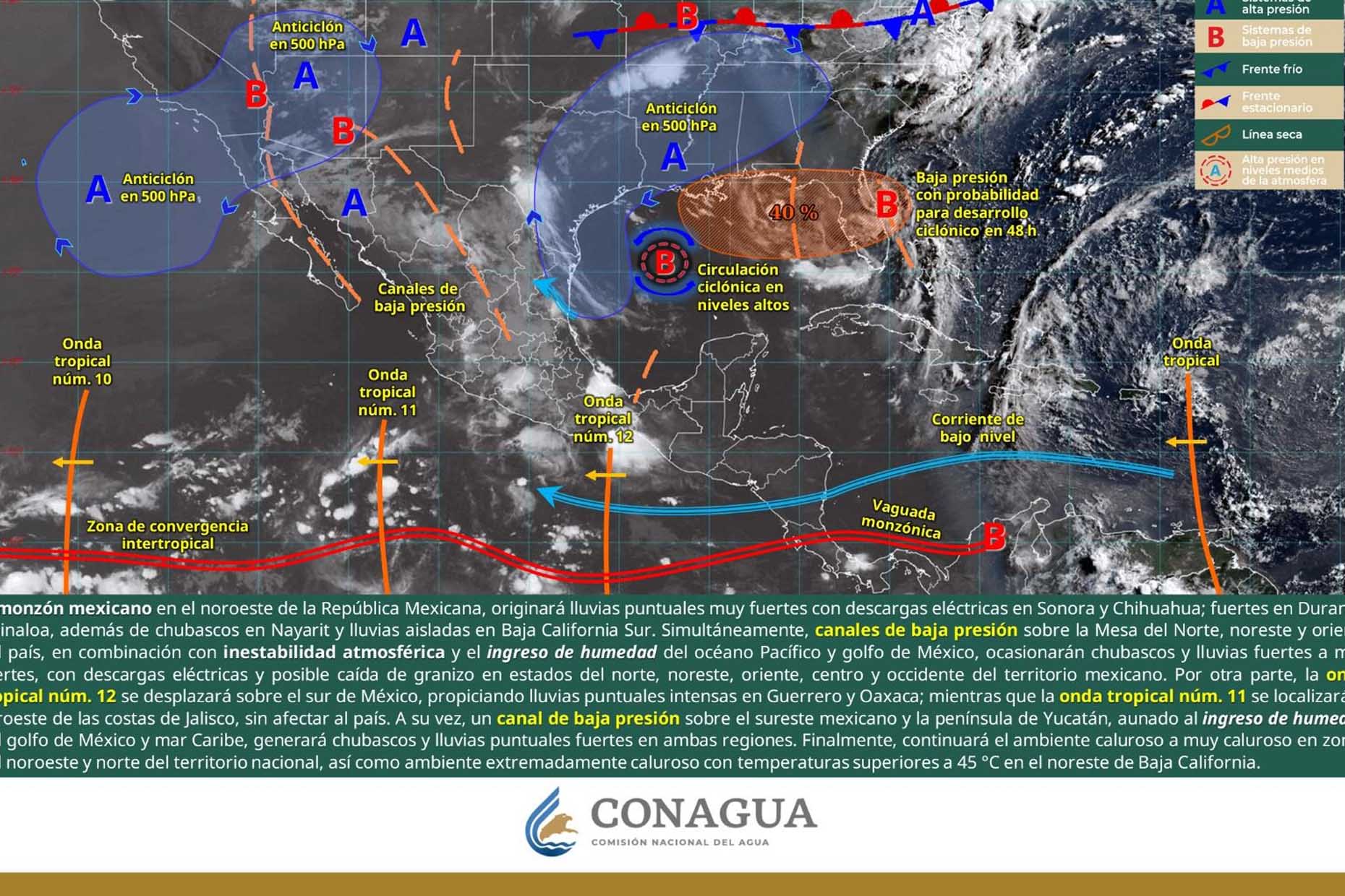 Lo anterior derivado de la onda tropical número 12 que se desplazará durante este día sobre Oaxaca, apoyada por un canal de baja presión e inestabilidad en niveles medios de la atmósfera.