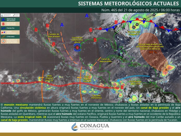 Todos esto debido a que se mantendrá la entrada de aire húmedo del Océano Pacífico y Golfo de México hacia el interior del estado, en combinación con el paso de la onda tropical número 24 apoyados por una baja superior.