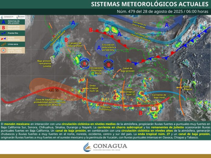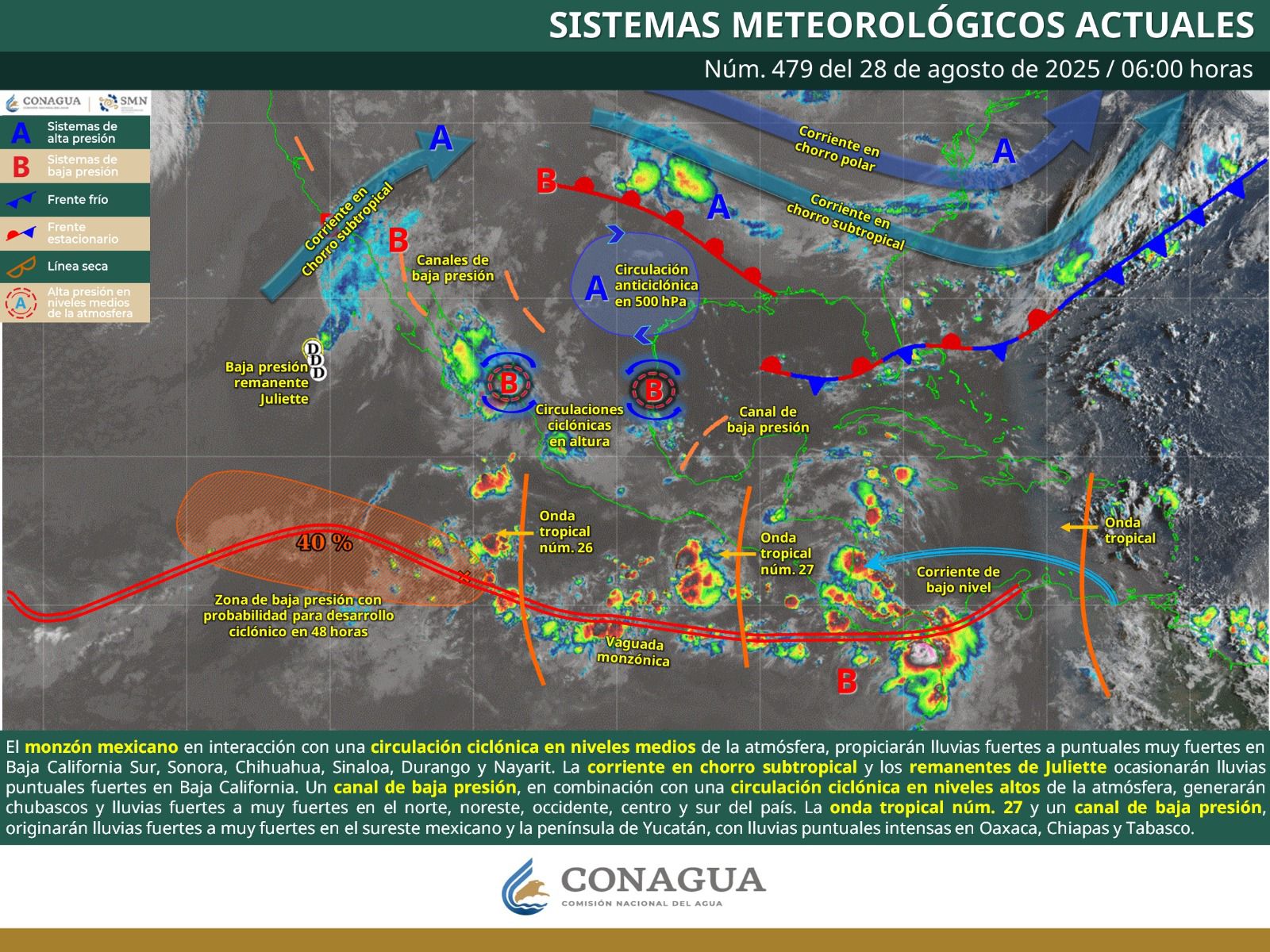 Todo esto es ocasionado por la onda tropical número 27 sobre el sureste de México, que avanza hacia el oeste a una velocidad promedio de 25 kilómetros por hora, apoyada por un canal de baja presión.