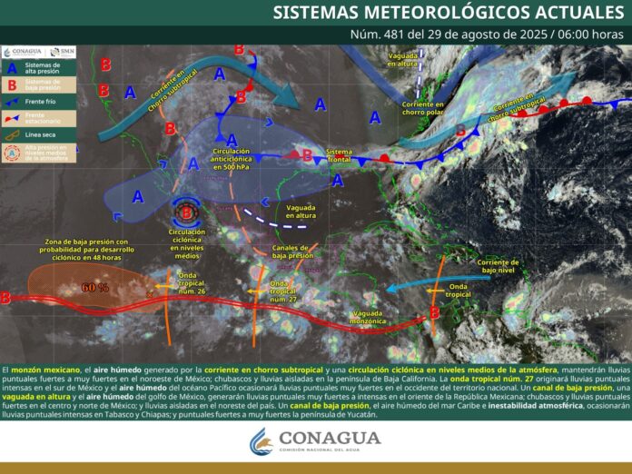 Además, se esperan probables áreas de niebla densa al amanecer en zonas de la Sierra Sur, Mixteca, Sierra de Juárez y Sierra de Flores Magón; derivada de la onda tropical número 27, que seguirá teniendo influencia sobre el estado en la medida que siga transitando hacia el oeste durante este día, con una velocidad promedio de 25 kilómetros por hora, apoyada por un canal de baja presión.