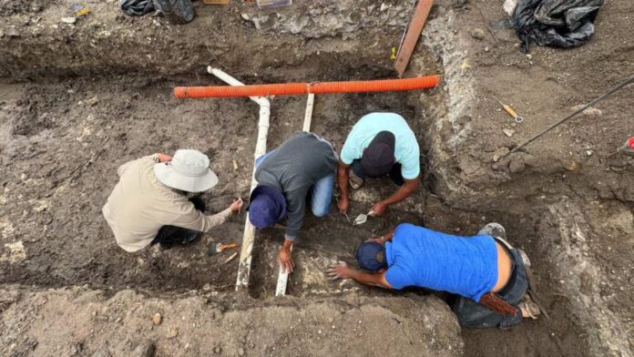 Durante los trabajos de pavimentación en la calle Miguel Alemán de San Pablo Villa de Mitla, se localizó un entierro presuntamente prehispánico, lo que llevó a suspender de manera temporal la obra municipal para resguardar el hallazgo.