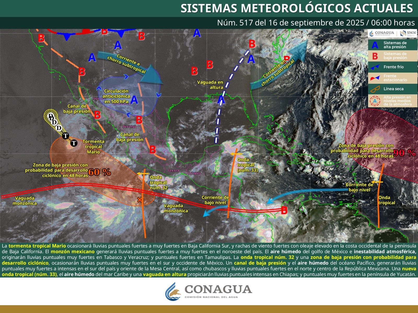 De acuerdo con el pronóstico del tiempo emitido por la Comisión Nacional del Agua (Conagua), todos estos fenómenos son debido a la onda tropical número 32 combinada con una zona de baja presión con potencial alto para desarrollo ciclónico que se desplazará sobre el occidente del país.