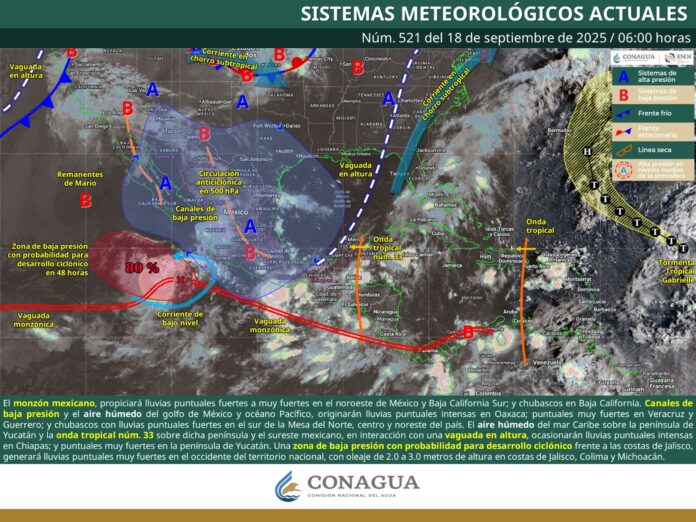 En las demás regiones las lluvias serán aisladas con áreas de tormentas dispersas en horas de la tarde, debido a la influencia directa de la onda tropical número 33 y el fuerte flujo de humedad que aporta la vaguada monzónica.