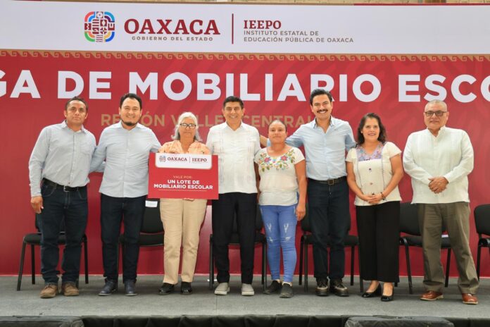 El Gobernador Salomón Jara Cruz entregó mobiliario a 102 escuelas de educación básica de Valles Centrales, en beneficio de 41 mil 816 estudiantes y 2 mil 400 docentes que podrán hacer uso de sillas y mesas nuevas; con una inversión de 13.1 millones de pesos.