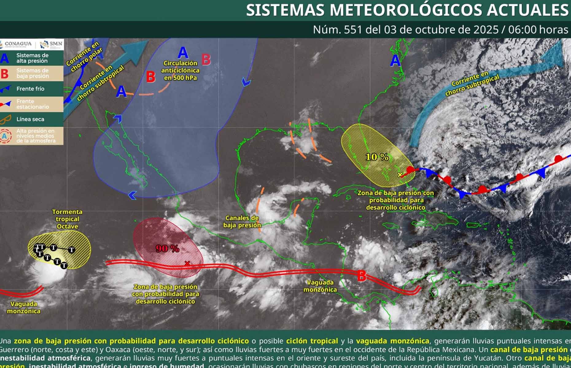 De acuerdo con el pronóstico del tiempo emitido por la Comisión Nacional del Agua (Conagua), estos fenómenos y el aporte de humedad son por la baja presión con alta probabilidad de desarrollo ciclónico al sur de Guerrero, aunado a la vaguada monzónica.