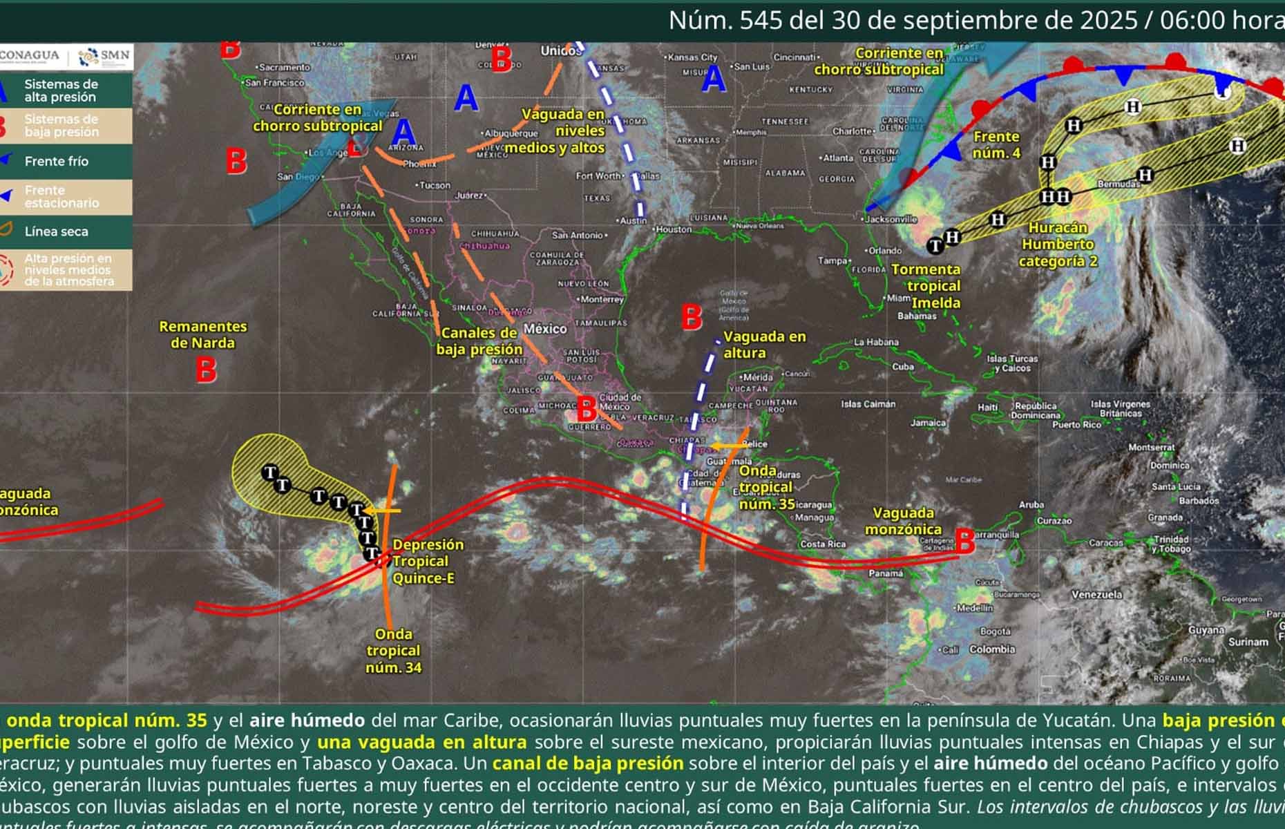 De acuerdo con el pronóstico del tiempo emitido por la Comisión Nacional del Agua (Conagua), todos los fenómenos son debido a la Onda Tropical número 35, la cual, será absorbida por una zona de baja presión con probabilidad de desarrollo ciclónico frente a la costa de Oaxaca.