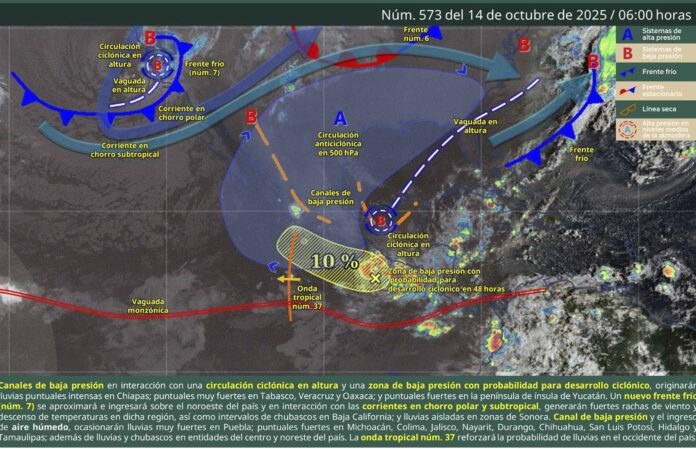 Asimismo, continúa en monitoreo la zona de baja presión al sur de las costas de Chiapas y Oaxaca.