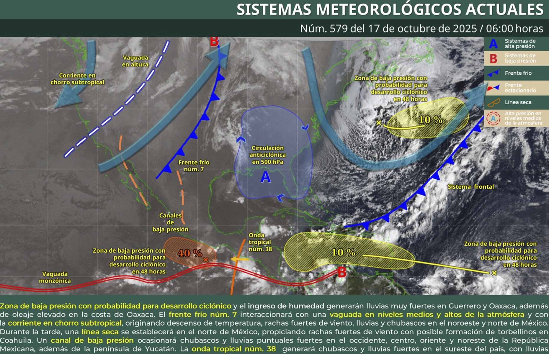 Ambos sistemas impulsan desprendimientos nubosos hacia el territorio oaxaqueño, favoreciendo la presencia de lluvias y actividad eléctrica.
