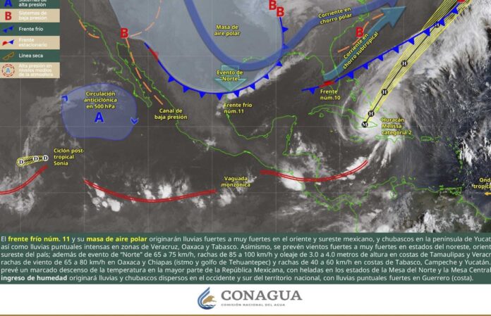 De acuerdo con el pronóstico del tiempo emitido por la Comisión Nacional del Agua (Conagua), esto es ocasionado por el desplazamiento del frente frío número 11 sobre el Golfo de México.