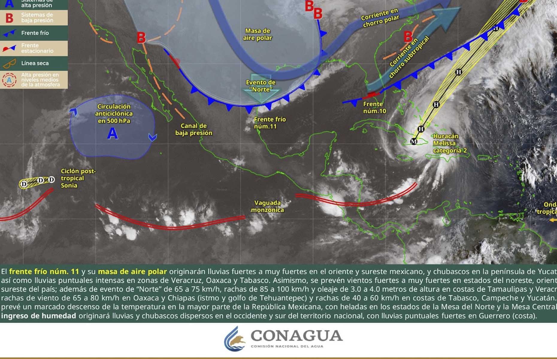 Por otro lado, el cambio en la presión atmosférica desarrollará evento de norte fuerte al oriente del Istmo y muy fuerte en el tramo La Venta-La Ventosa; estos vientos se trasladarán hacia aguas del Golfo de Tehuantepec donde se tendrá oleaje elevado y mar picado.