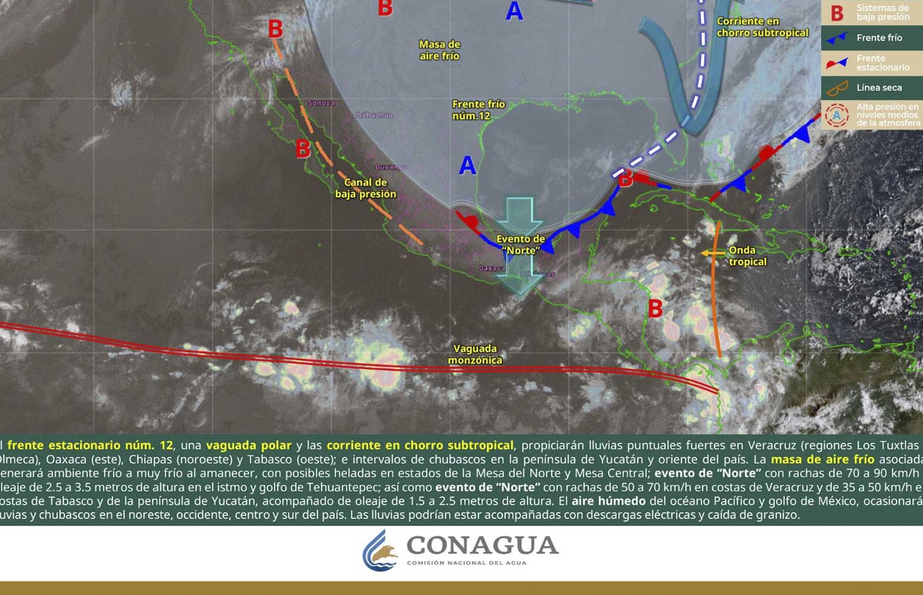 De acuerdo con el pronóstico del tiempo emitido por la Comisión Nacional del Agua (Conagua), estas condiciones son ocasionadas por una masa de aire frío que le da impulso al frente frío número 12, el cual recorrerá el litoral del Golfo de México y la Península de Yucatán, tomando características de estacionario al final del día.