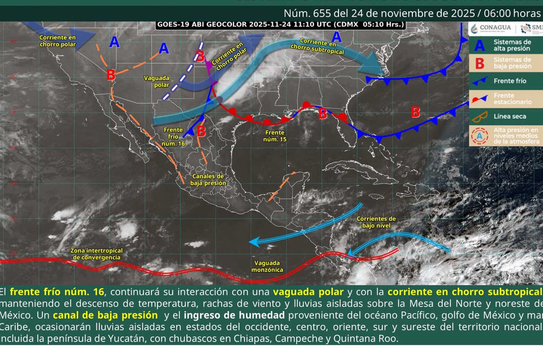 Por otro lado, el miércoles se espera la incursión del frente frío número 16 con mezclas invernales de lluvias, evento de norte y niveles más bajos en el termómetro.