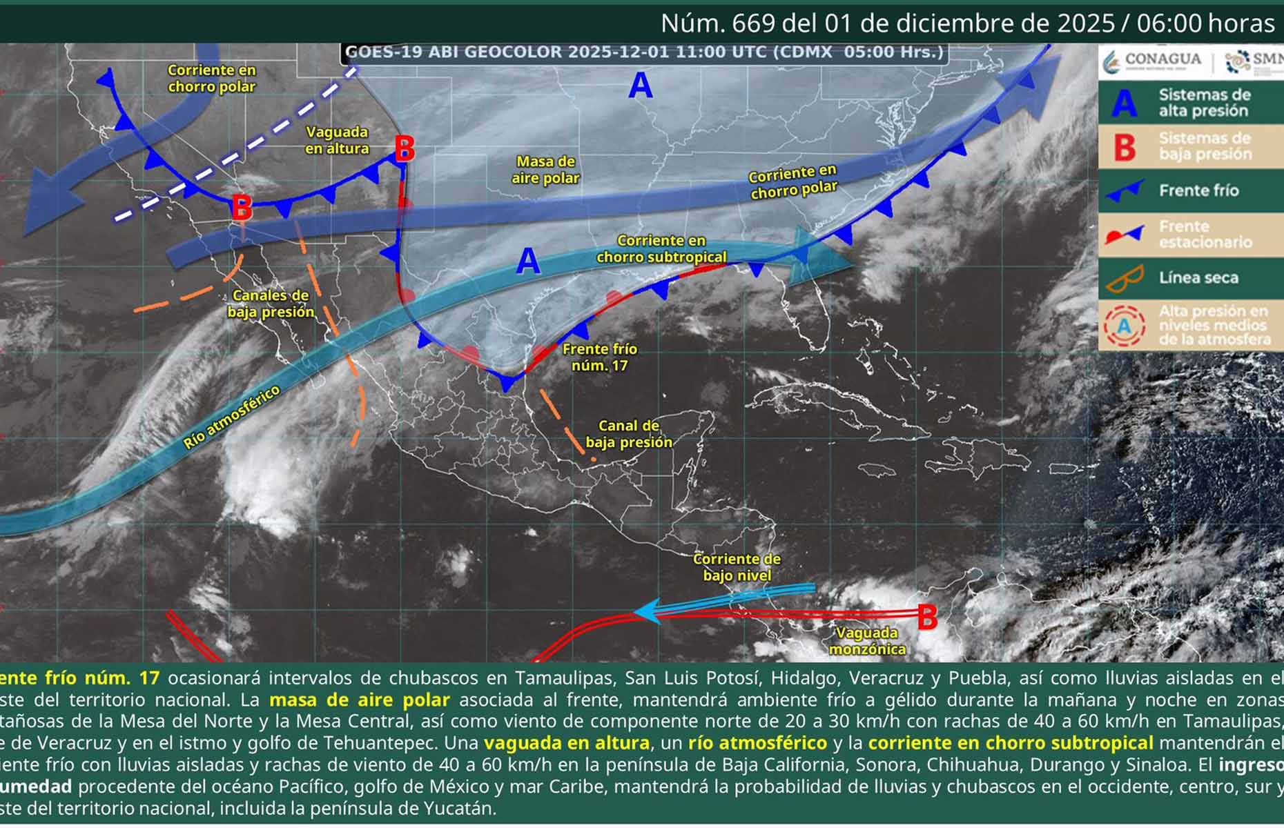 De acuerdo con el pronóstico del tiempo emitido por la Comisión Nacional del Agua (Conagua), el frente frío número 17, de carácter débil, se localiza sobre el oriente de México. Por delante de este sistema, un anticiclón en niveles medios de la atmósfera actúa como bloqueo e impide su avance hacia el sureste.