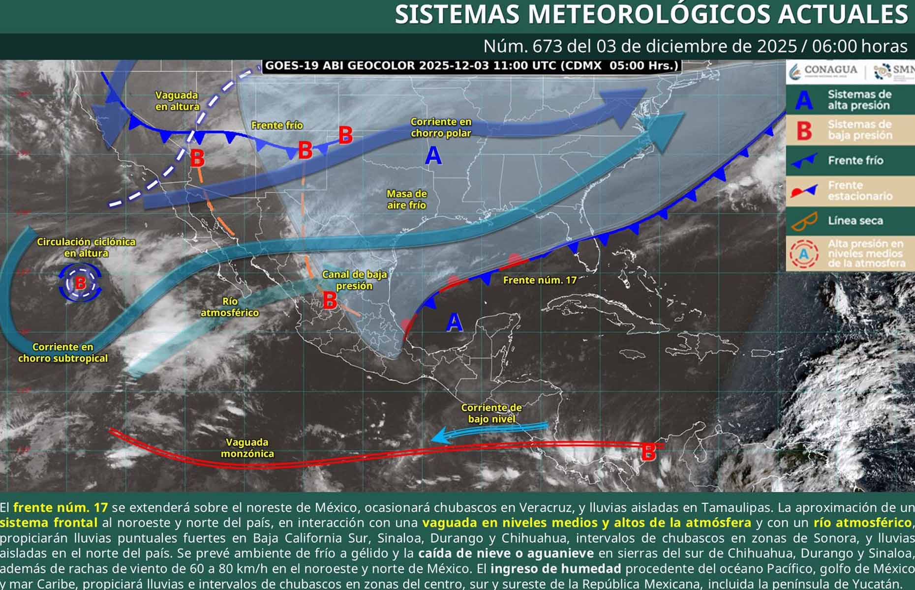 De acuerdo con el pronóstico del tiempo emitido por la Comisión Nacional del Agua (Conagua), esto se debe a que el frente frío número 17 permanece casi estacionario sobre el noreste de México, bloqueado por un fuerte anticiclón ubicado en niveles medios y altos de la atmósfera.