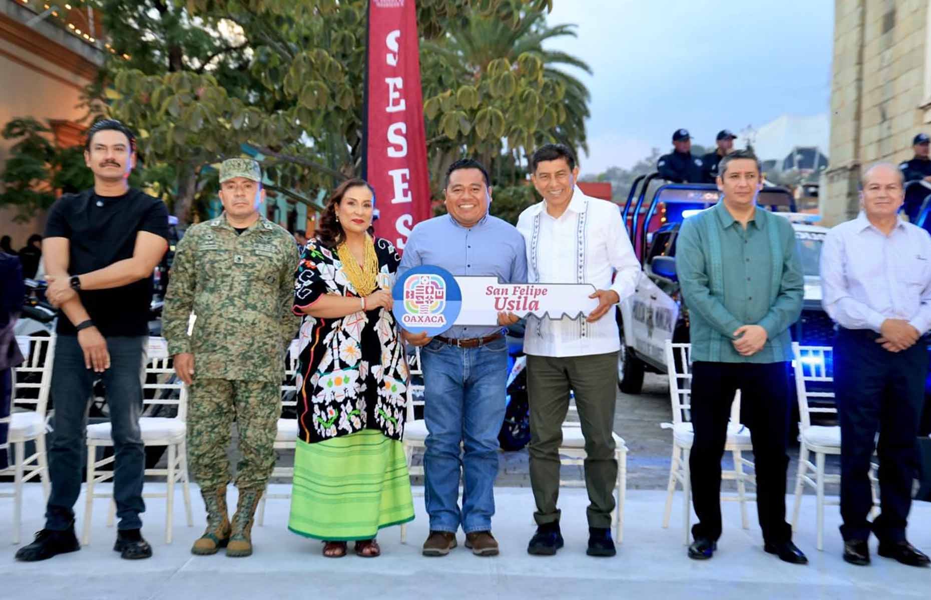 En representación del Mandatario oaxaqueño, la titular del Secretariado Ejecutivo del Sistema Estatal de Seguridad Pública (SESESP), Karina Barón Ortiz informó que la entrega consistió en camionetas pick up equipadas como patrullas para ocho localidades y motopatrullas para otras 29; además de camionetas para la Fiscalía General del Estado (FGEO) y la Universidad de la Seguridad Pública y Paz Social de Oaxaca (Usepaz).