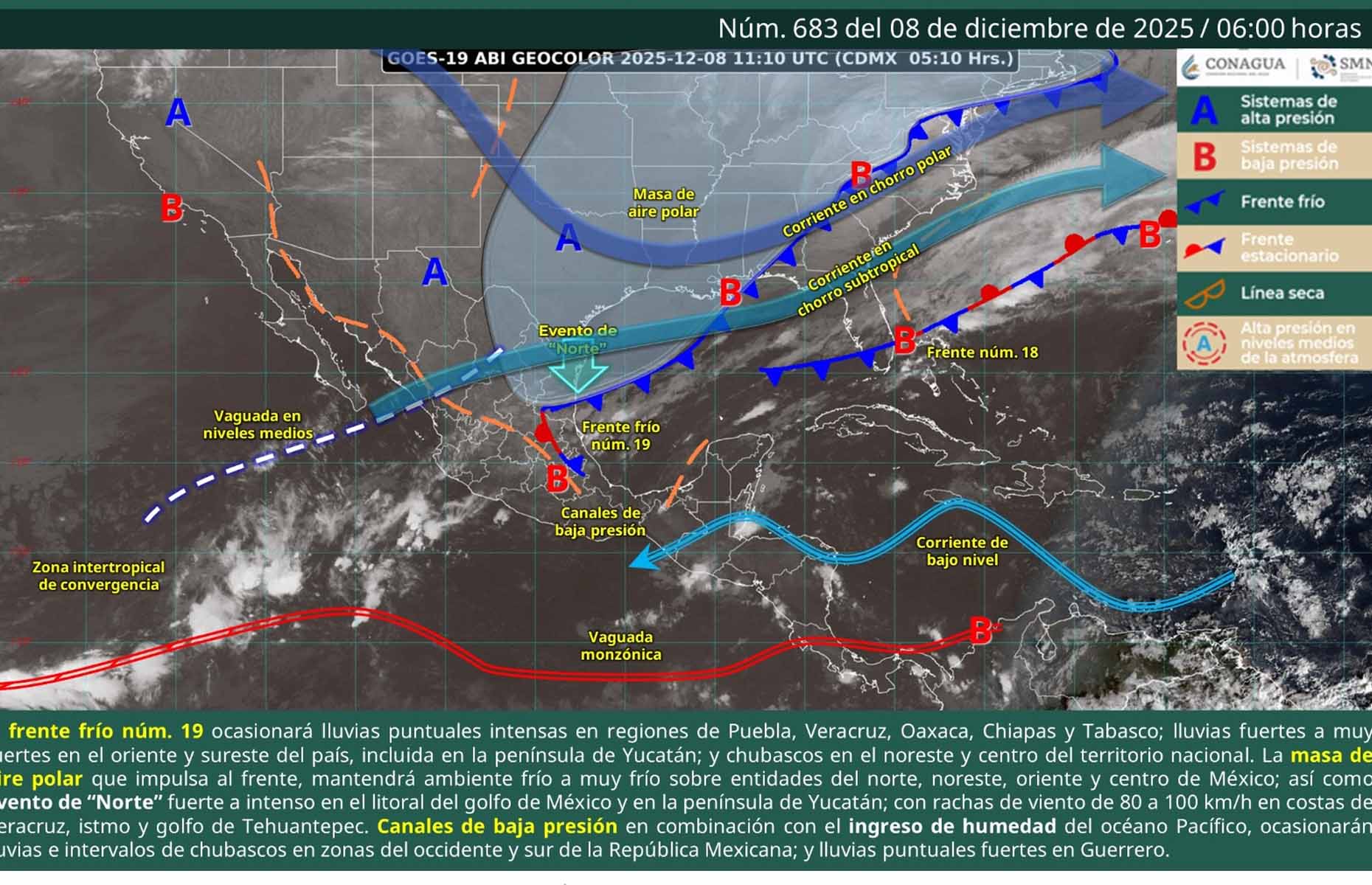 De acuerdo con el pronóstico del tiempo emitido por la Comisión Nacional del Agua (Conagua), la masa de aire frío que impulsa este sistema provocará un descenso en la temperatura, así como evento de norte de fuerte a muy fuerte en el Istmo y Golfo de Tehuantepec, con oleaje elevado y baja sensación térmica debido a las condiciones ventosas.