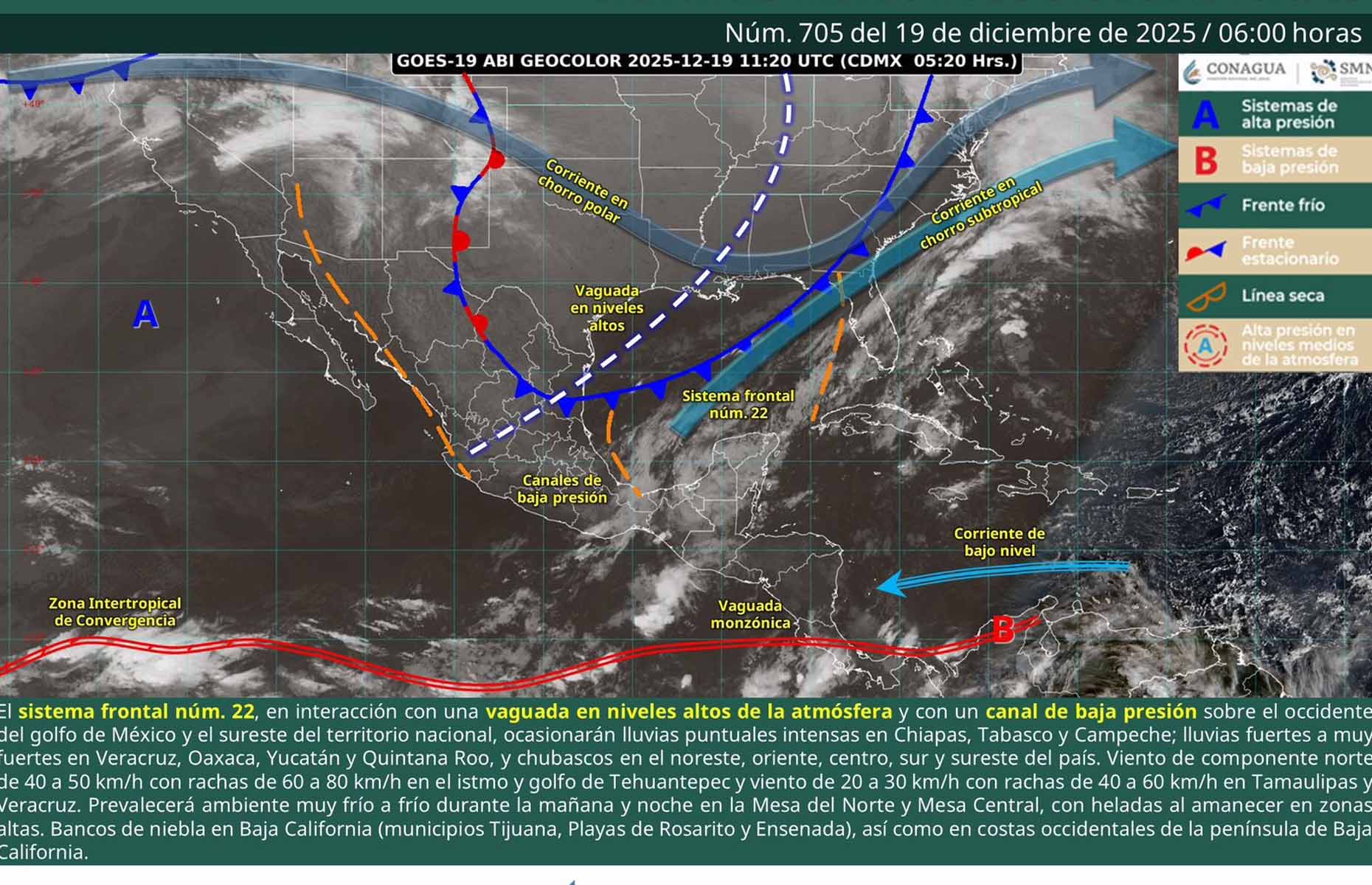El frente frío número 22, de carácter débil, se extenderá durante este viernes sobre el noreste de México, aunque es poco probable que avance hacia el sureste, permitirá ligeros escurrimientos de aire frío hacia regiones altas de la entidad.