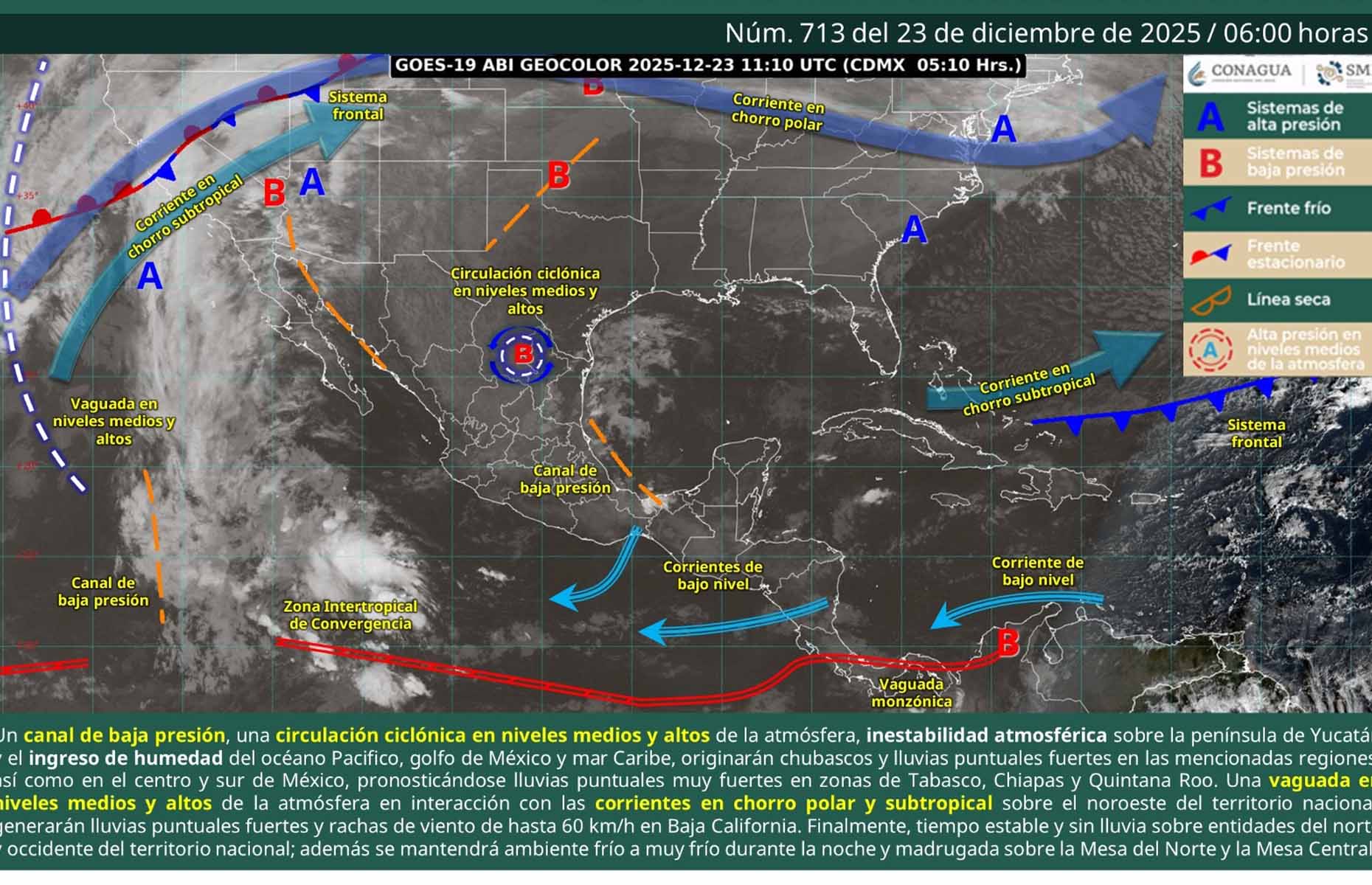 Estas condiciones se derivan de la interacción de un canal de baja presión extendido sobre el oriente y sureste de la República Mexicana, en combinación con un sistema de alta presión que favorece una circulación anticiclónica.