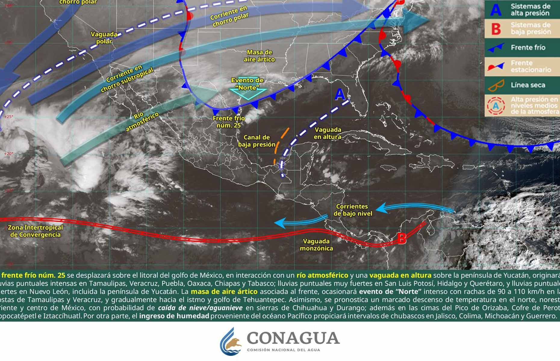 De acuerdo con el pronóstico del tiempo emitido por la Comisión Nacional del Agua (Conagua), estas condiciones provocarán evento de norte de muy fuerte a intenso durante la madrugada del martes, con mayor impacto en el oriente del Istmo de Tehuantepec, que se extenderá hacia el Golfo de Tehuantepec; donde se espera oleaje elevado y condiciones peligrosas para la navegación marítima.