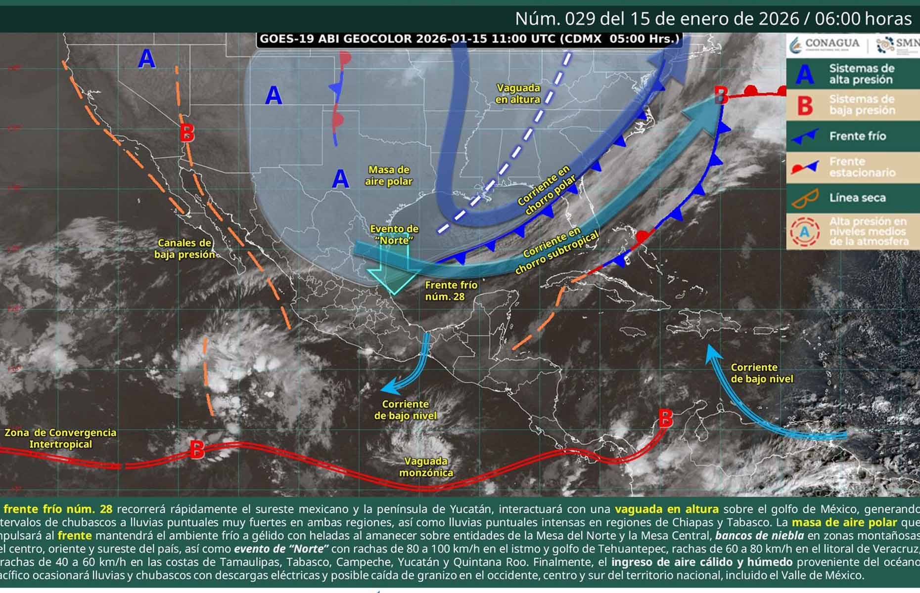 De acuerdo con el pronóstico del tiempo emitido por la Comisión Nacional del Agua (Conagua), estas condiciones se derivan del frente frío número 28, el cual avanzará rápidamente hacia el sureste y la Península de Yucatán.