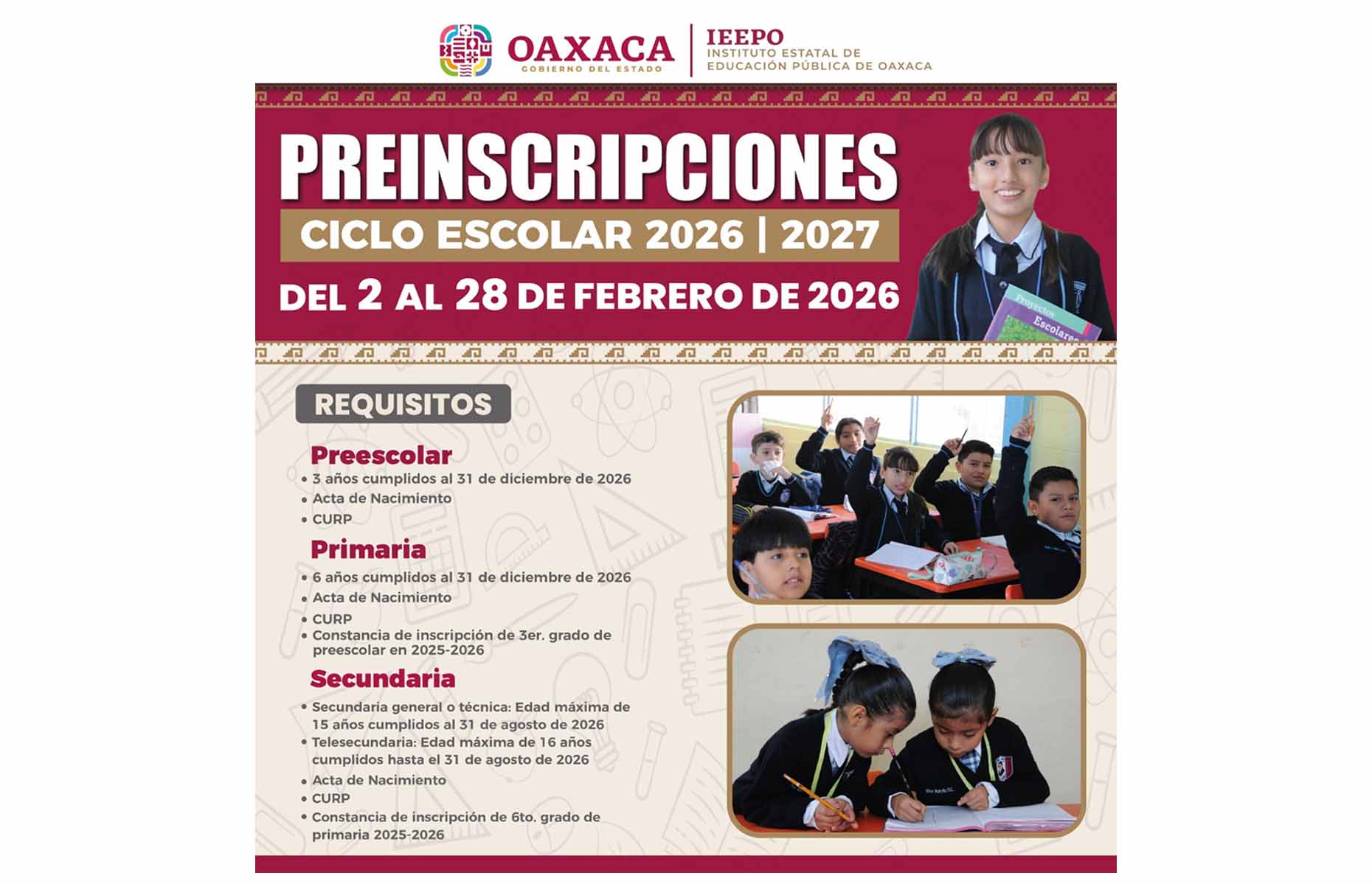 El Instituto Estatal de Educación Pública de Oaxaca (IEEPO) informa a madres y padres de familia, así como a personas tutoras, que el proceso de preinscripción del ciclo escolar 2026–2027 se realizará del 2 al 28 de febrero para los niveles Preescolar, primero de Primaria y de Secundaria.