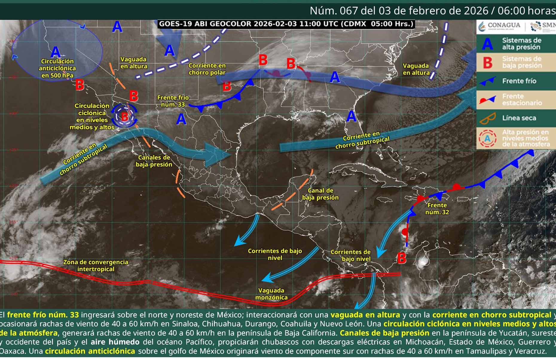 La Coordinación Estatal de Protección Civil y Gestión de Riesgos (CEPCyGR) informa que el nuevo frente frío número 33, que se extenderá sobre el norte y noreste de México, comenzará a generar efectos en la entidad a partir de mitad de la semana.