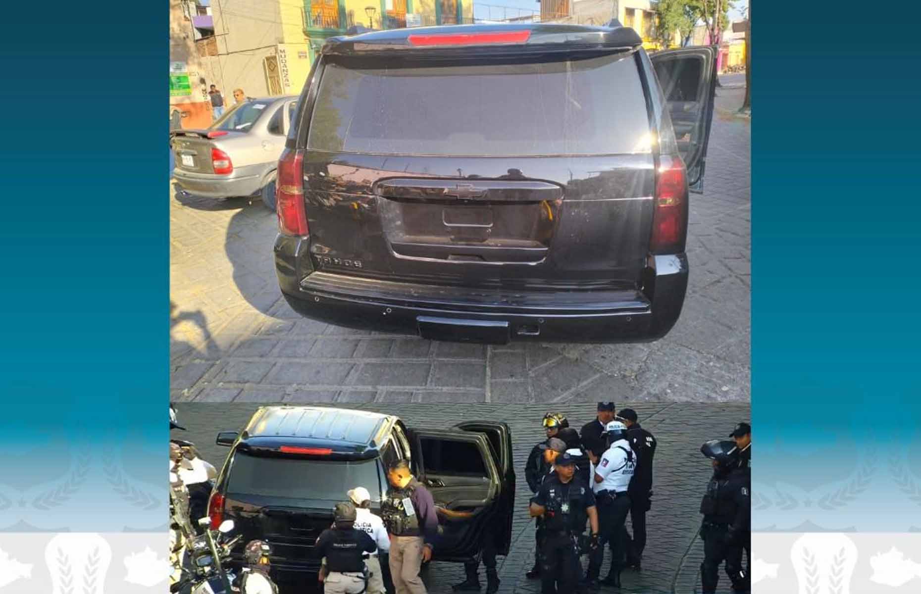 A las 8:38 horas, elementos de la Policía Municipal interceptaron y aseguraron una camioneta marca Chevrolet Tahoe, color negro, con vidrios polarizados y sin placas de circulación. La unidad presenta impactos de arma de fuego en la puerta del conductor.