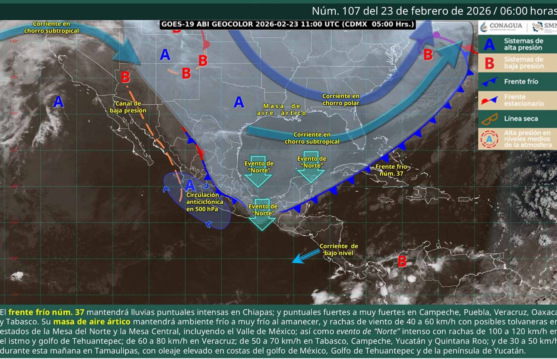 La masa de aire frío que impulsa un sistema frontal continuará generando rachas de viento muy fuertes a intensas, de 100 a 120 kilómetros por hora en el oriente del Istmo de Tehuantepec, particularmente en el tramo La Venta–La Ventosa. Asimismo, se prevé oleaje elevado y mar picado en aguas del Golfo de Tehuantepec, además de tolvaneras en zonas planas.