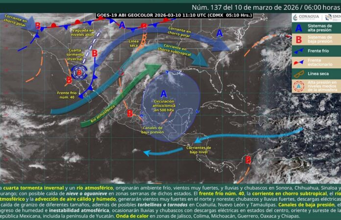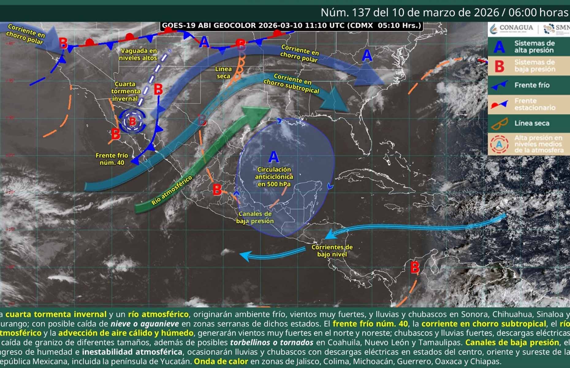 Lo anterior se debe a la presencia de un canal de baja presión ubicado sobre el interior del país, en combinación con la entrada de humedad proveniente del Océano Pacífico y Golfo de México.